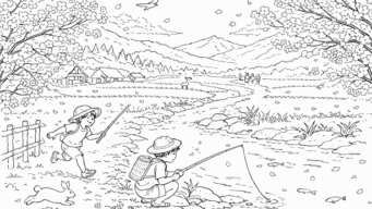 scenery 春の田舎 子供達|塗り絵 高齢者 無料 印刷