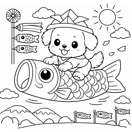鯉のぼりだワン|塗り絵 高齢者 無料 印刷
